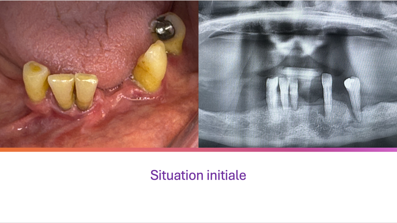 Ses dents du bas sont mobiles et douloureuses. Elles ne peuvent plus stabiliser l’ancienne prothèse du bas. La patiente vient nous voir dans l’attente d’une solution stable et esthétique.