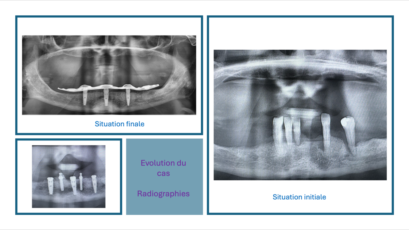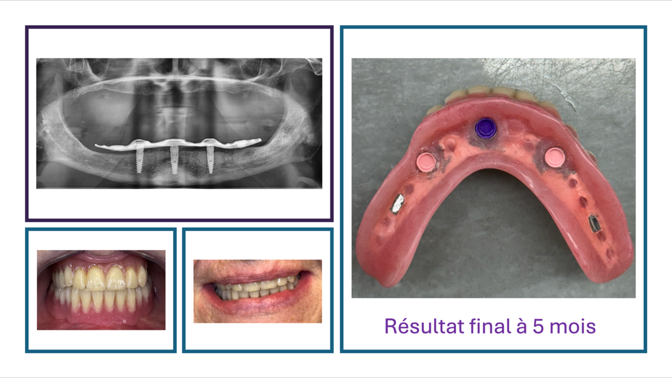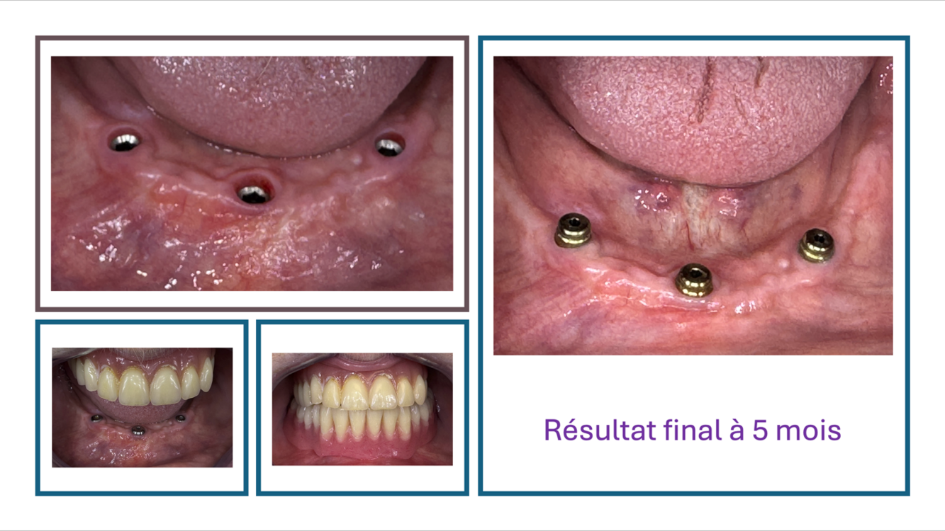 À 6 mois post-opératoires, la prothèse définitive stabilisée sur 4 implants a été réalisée en quelques séances.